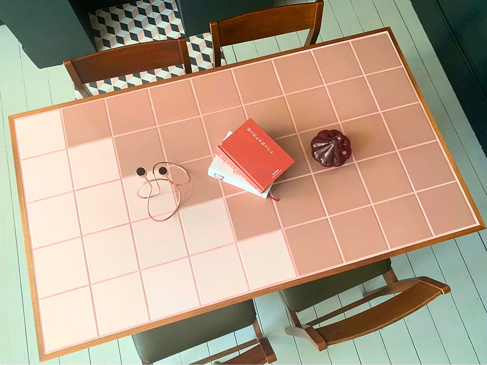 Dining table with crisp white and primrose yellow tiles, punctuated by red grout and a solitary red tile.