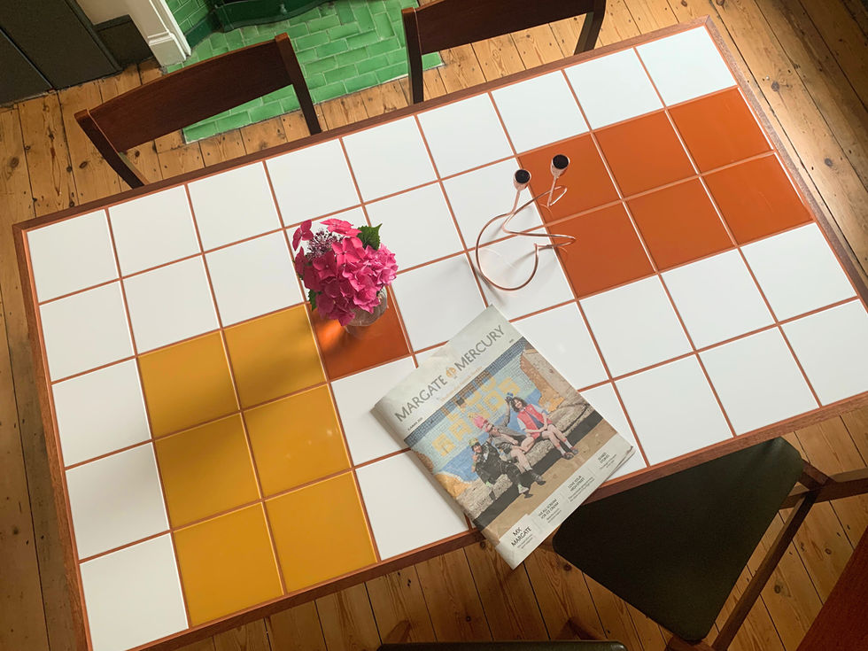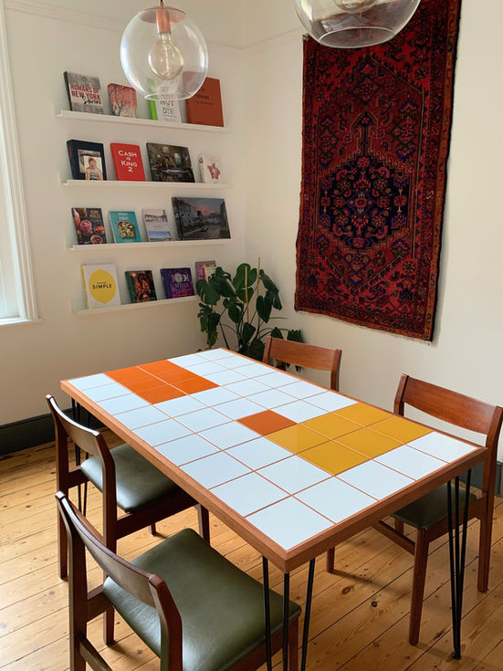 Dining table with bold blocks of burnt orange, mustard and crisp whites - punctuated with striking orange grout.